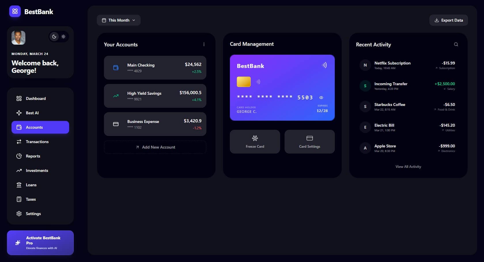 Manage multiple accounts—from Main Checking to High-Yield Savings—with ease. The platform includes a dedicated card management suite for real-time control over physical and digital assets.