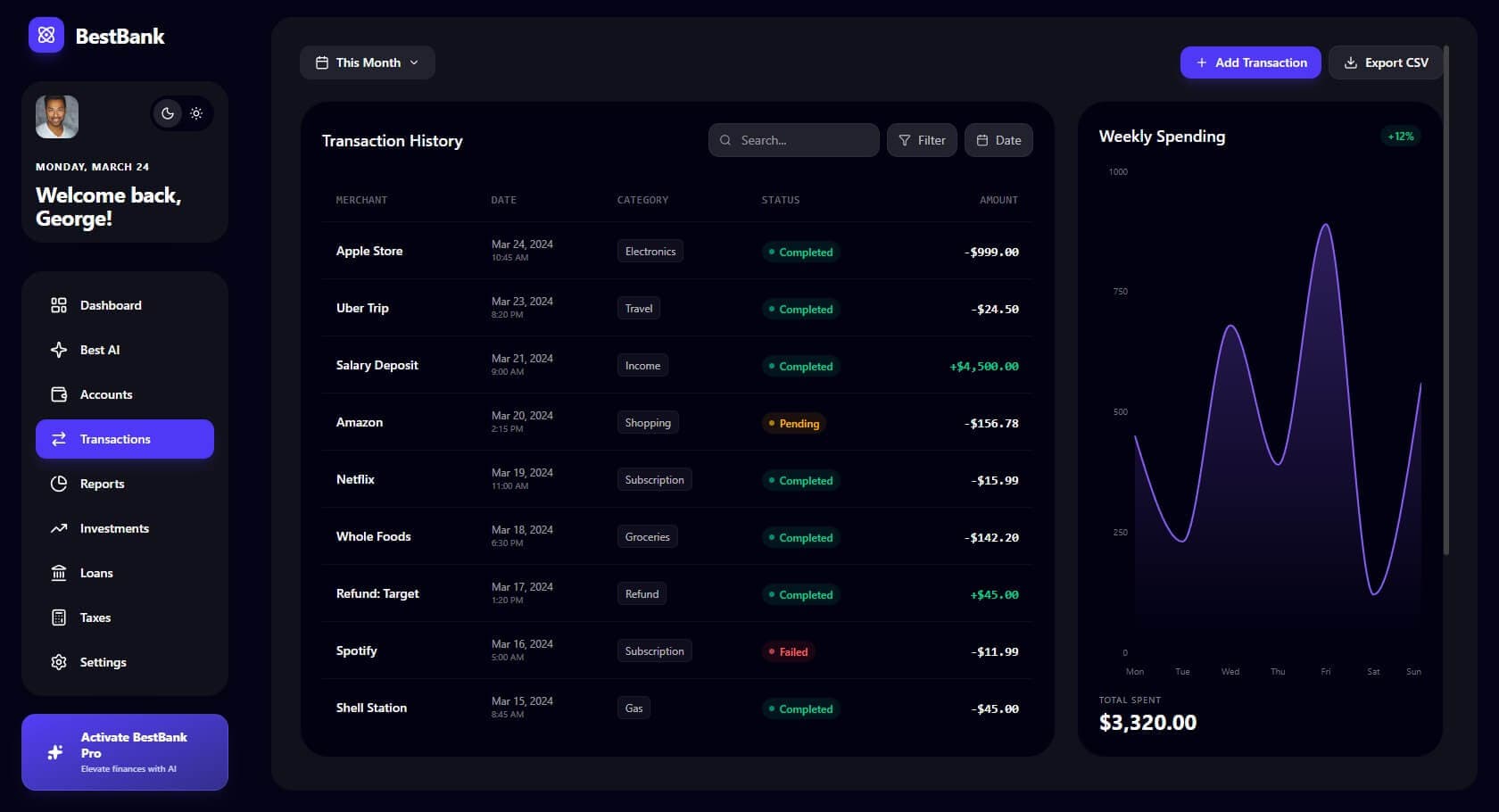 The advanced 'Transaction History' suite combines robust filtering with weekly spending visualizations, giving users a granular view of their capital flow across all categories.