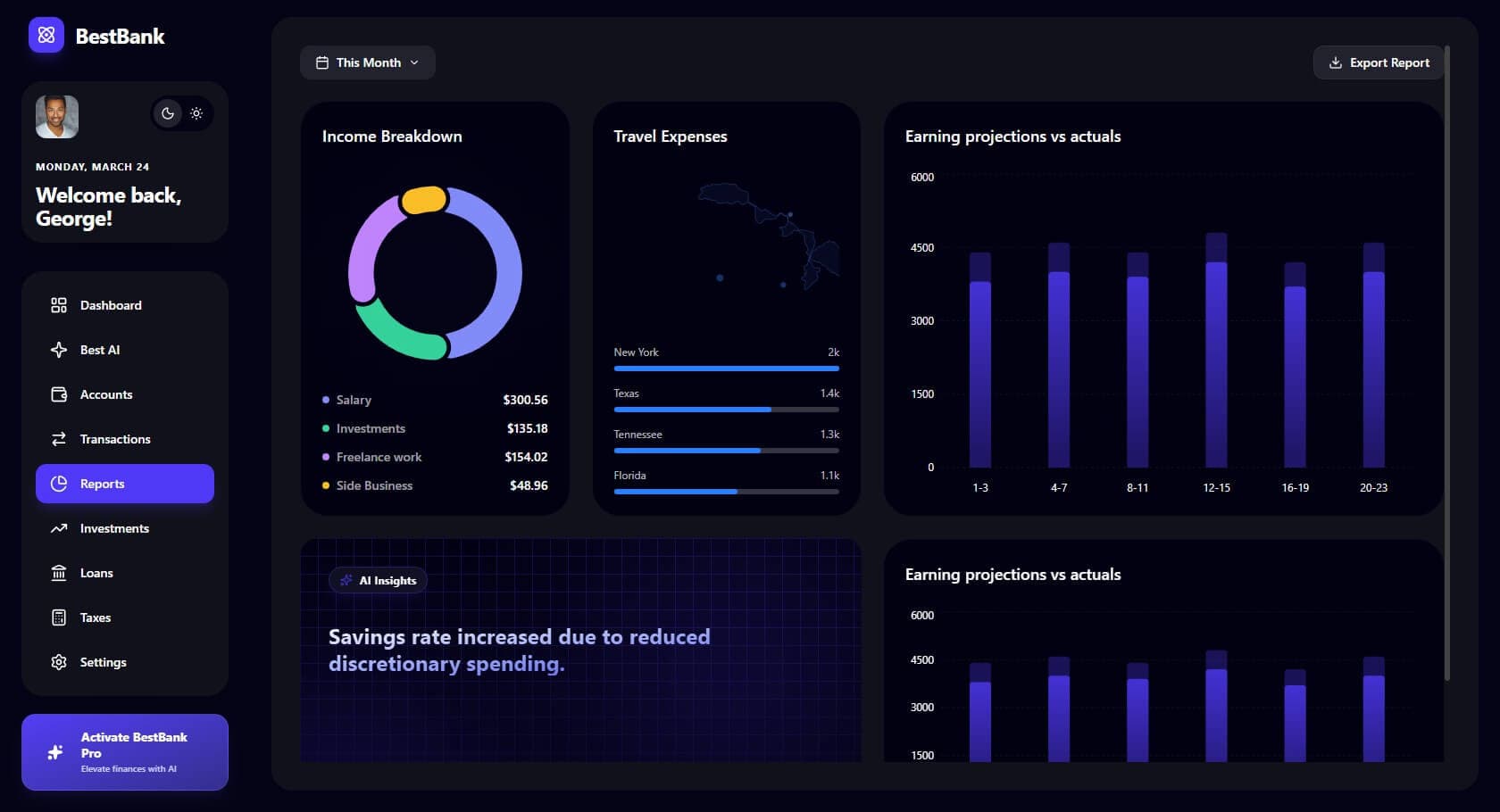 From income breakdown charts to earning projections vs. actuals, BestBank's reporting suite offers powerful visualizations (Recharts) to help users plan for the future with confidence.
